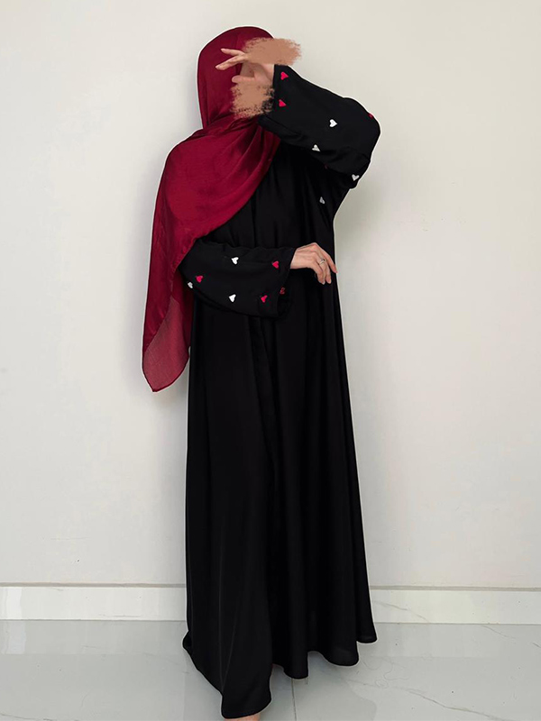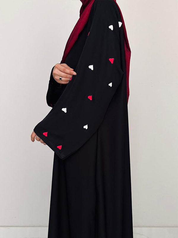 Playful yet elegant, this black Abaya features charming red and white heart embroidery across the sleeves, adding a sweet, youthful twist to a classic look. Paired with a bold red scarf, it strikes the perfect balance between tradition and modern style — ideal for making a statement with subtle grace.
